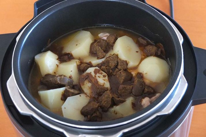 運転開始後40分くらいで圧力表示ピンが落ちた(写真上)ので、ふたを開けて溶けやすいよう細かく切ったカレールーを入れ、ルーが溶けるまで5分ほど煮込みました。ちなみにルーは最初から入れると焦げてしまうので、必ず無水(圧力)調理終了後に入れます