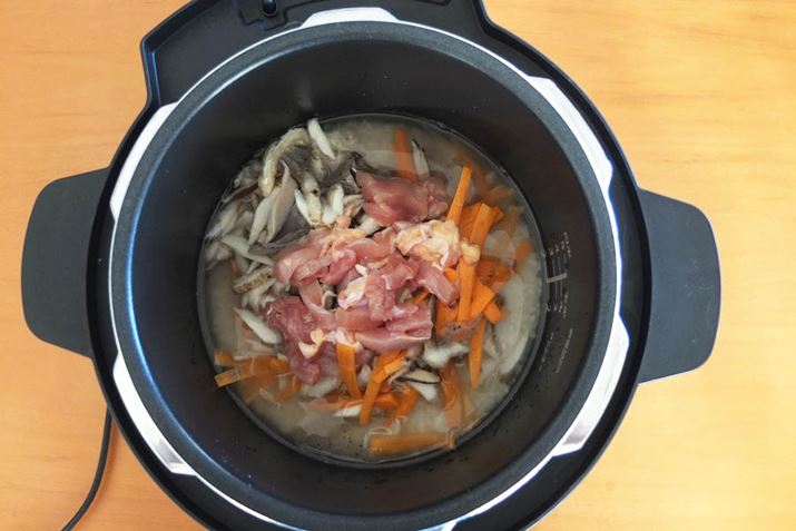 白米炊飯と同じ分量の水を入れ、上に炊き込みごはんの具材を乗せて炊飯します。具材は絶対に米とかき混ぜて炊かないようにするのがおいしく炊くコツです