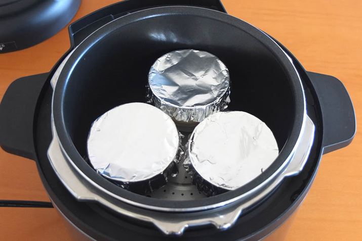 卵、砂糖、牛乳を混ぜ、バニラエッセンスを加えた原液を耐熱ガラス容器に流し込み、圧力鍋の上に敷いた付属の蒸し板に容器を並べます。原液は1度茶こしでこすことでなめらかさアップ。蒸気が冷えたつゆが入らないように、容器にはアルミホイルでふたをしました
