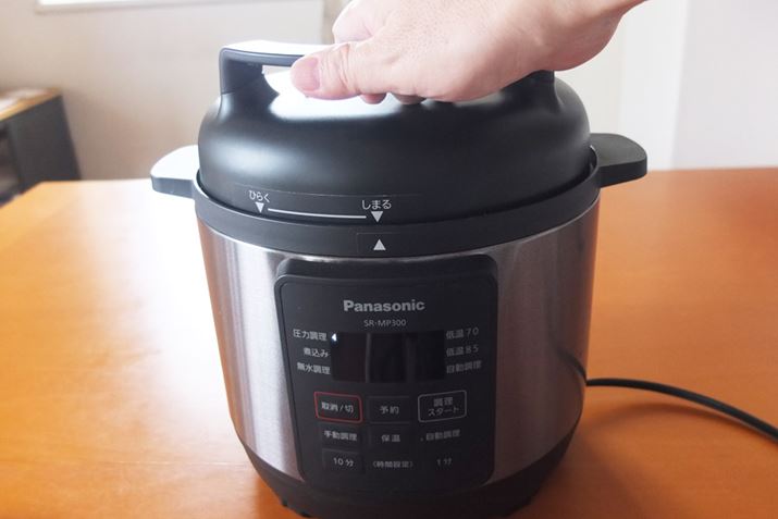 SR-MP300の操作性、使い勝手に関しても見ていきましょう。まず、ふたの開閉に関してはガス式の圧力鍋と比べるととても簡単で、ふたと本体の矢印を合わせてから、ふたを回せば簡単に閉められます。閉まる時にカチッとしっかりロックされた感覚があるのも好印象です。