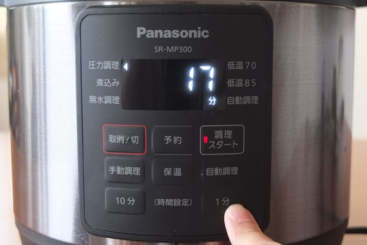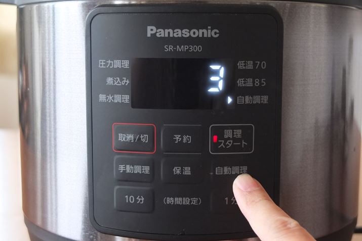 ボタン操作は、手動調理の場合は「手動調理」ボタンを押すごとにモードが切り替わり、目的のモードになったら加圧/加熱時間を設定し、「調理スタート」ボタンを押せば調理開始。自動調理の場合は「自動調理」ボタンを押すごとに自動調理コースの番号が進みます。