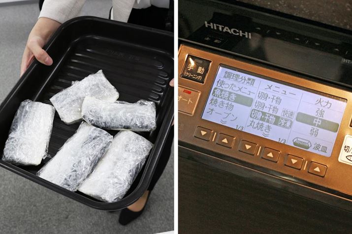従来のオート調理では冷凍した魚は解凍しなければなりませんでしたが、新モデルは解凍から焼き上げまでおまかせ! 市販のものだけでなく、自宅で冷凍した魚もオート調理でき、切り身、干し物、つけ焼きにも対応します。新モデルに追加された魚焼き調理「冷凍のまま」メニューは、解凍約5分、焼き上げ約16分の工程を経るもの。レンジや自然解凍してから焼くより、解凍時間が短く、調理皿に移し変える手間もないため、時短につながります。