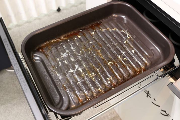 調理皿は深さが約4.1cmあるので、油の飛び跳ねをガードしてくれるのだそう。油まみれになったグリル部を掃除するより、調理皿を洗うほうが断然ラクなのは間違いありません