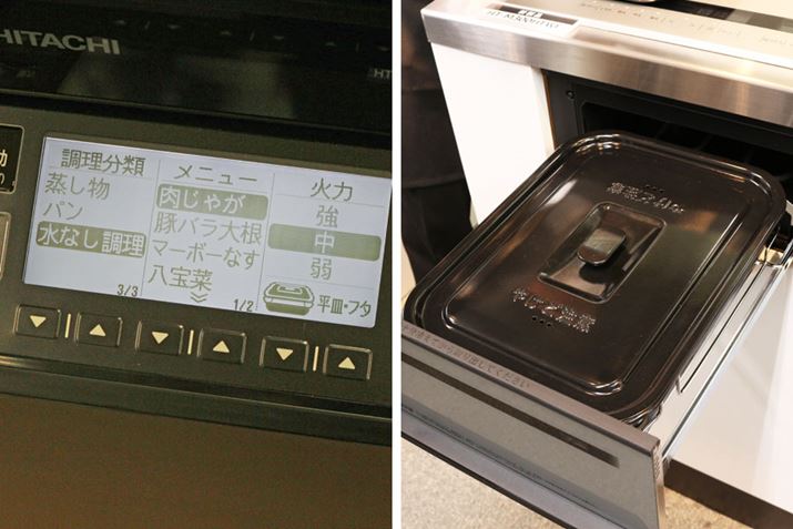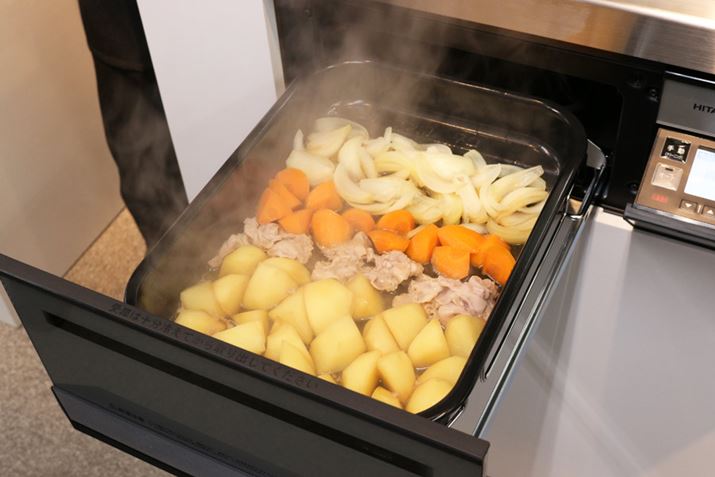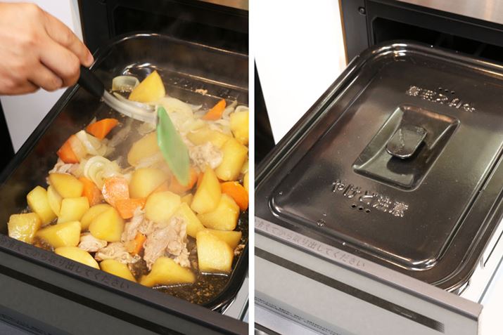 筆者が見ることができたのは、水なし調理「肉じゃが」メニューの加熱が終わった状態から。水なし調理は「ラク旨オーブン」とフタを使うようです