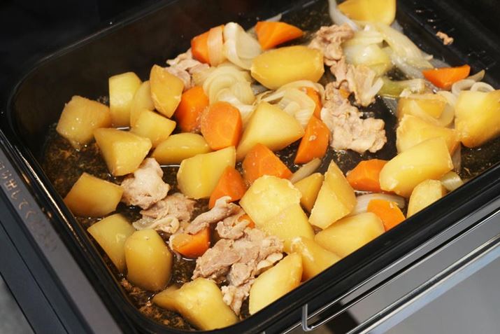 加熱約35分+保温約10分のトータル約45分で完成した肉じゃが。少々手作業は発生しますが、加熱中はほったらかしでいいので手間にはそれほど感じなそう。頻繁に混ぜる必要もないため、じゃがいもの角が崩れておらず、仕上がりはとてもキレイです