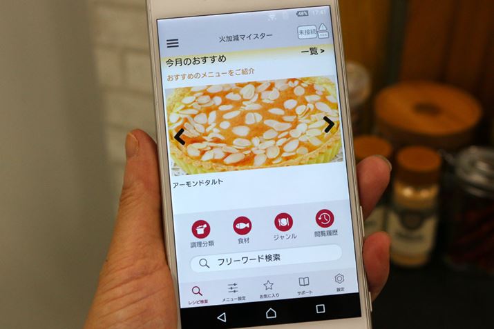 近年のトレンドであるIoT化に「T-M350T/HT-M150T」シリーズも対応しています。日立は、スマートフォンとBluetoothで接続する「HT-L350T」シリーズを2018年に受注生産でリリースしていますが、新モデルは規格もアプリもまったく別物。無線LAN機能を搭載し、Wi-Fiで接続する仕様となり、専用アプリ「日立IHクッキングヒーターアプリ」(無料)も新たに開発されました。アプリでレシピを検索し、必要な材料や作り方を確認できるのはもちろん、選択したレシピを送信すれば、火加減や加熱時間などの設定がIHクッキングヒーターにセットされる便利な機能も搭載されています。現在、「日立IHクッキングヒーターアプリ」にはクッキングガイド掲載レシピ300種類のほか、アプリ上にしかない「適温調理サポート」に対応するレシピ30種類を用意。「適温調理サポート」とは次の工程に進むタイミングを音声でお知らせしてくれる機能(トッププレートでのIH調理限定)で、プリインストールされているレシピならIHクッキングヒーターからの操作でも使えます。