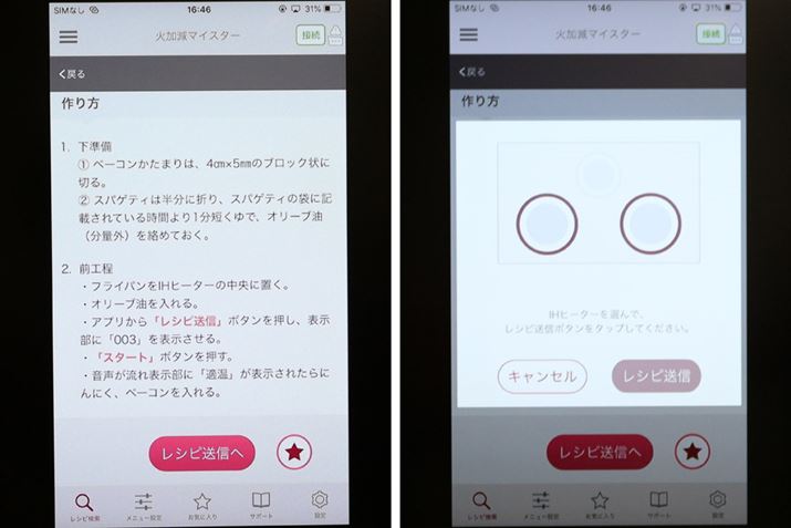 調理の設定を送信する前に、加熱する手前まで準備をしておきましょう。準備を終え、加熱する段階になったら「レシピ送信へ」をタップし、どのIHヒーターで調理するのかを選びます