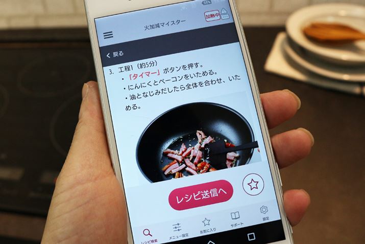 テキストでの説明だけではわかりづらいので、アプリ上にしかないレシピをIHクッキングヒーターに送信し、「適温調理サポート」で調理する流れを写真と動画で紹介しておきましょう。今回作るのは、カルボナーラのソースです(紹介はしていませんが、同時進行で麺を茹でています)。
