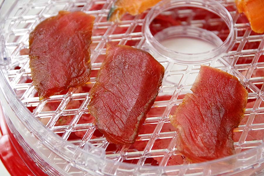 サーモンに比べて圧倒的に硬い。透けるほどペラペラとなり、これぞマグロジャーキーという存在に