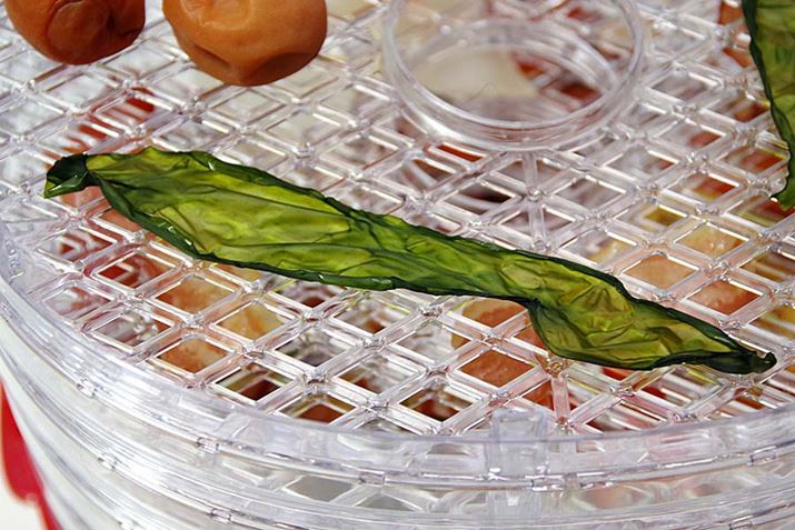5段いっぱいに食材を干してみました。赤い本体部分にヒーターがあるので、そこから近い下段のほうが乾燥しやすいかな