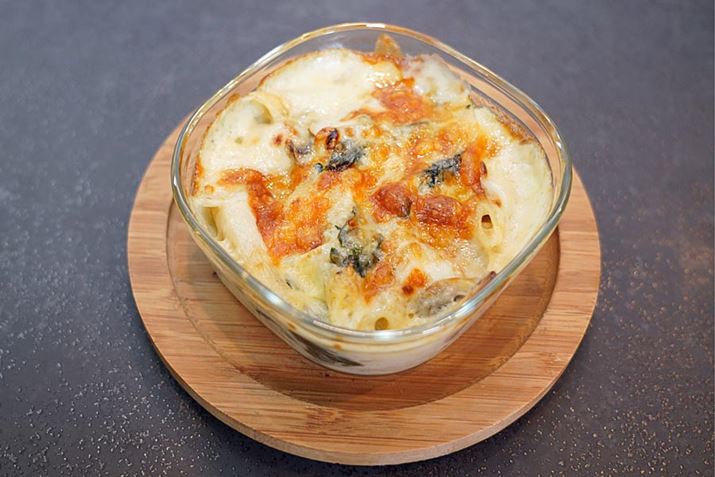 【5】ホワイトソースに玉ねぎ、マッシュルーム、マカロニ、ほうれん草を加えて混ぜて、ひと煮立ちさせ、耐熱容器に入れ、シュレッドチーズをかける。