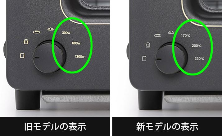 BALMUDA The Toasterの「クラシックモード」では、3つの温度設定を選択可能。実はこの「クラシックモード」の表示が1度デザインチェンジしています。旧モデルでは「1300W」と出力W数表示だったのですが、デザインチェンジ後の現行モデルでは「230℃」と温度表示になりました。よりわかりやすいですね