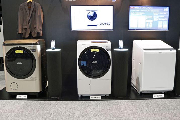 左が、今回発表された「ヒートリサイクル 風アイロン ビッグドラム BD-NX120E」(市場想定価格38万円前後/税別)で、中央と右は9月に発売された「ヒートリサイクル 風アイロン ビッグドラム BD-SX110E」と「ビートウォッシュ BW-DX120E」