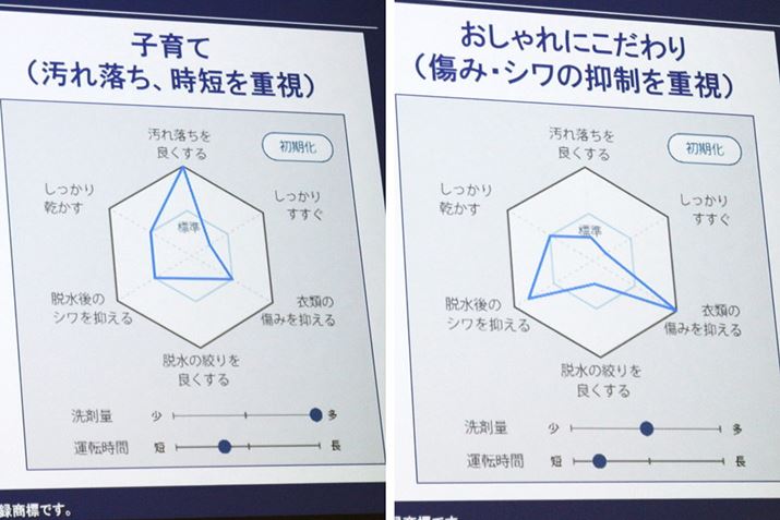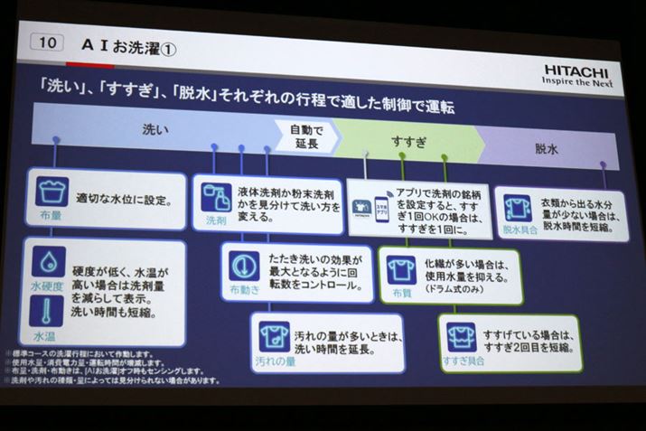 また、従来モデルで採用された「AIお洗濯」は3機種とも継承。AIお洗濯とは、洗い、すすぎ、脱水の工程で「布量」「水硬度」「水温」「洗剤」「布の動き」「汚れの量」「布質」「すすぎ具合」「脱水具合」という9つの要素をセンシングし、適した制御を行うというもので、センシングが複合して行われるのがポイントです。AIお洗濯を搭載しない洗濯機でも、センサーを用いて同様の制御はできるものの、いくつかに分かれた機能をそれぞれ設定しなければなりませんでした。また、「エコ」と「汚れ落ち」といった相反する目的の自動調節機能は同時に設定できないことも。このようなめんどうな設定も、AIお洗濯ならボタンをひとつ押すだけ。一般的なセンシングよりも、より複合した制御が行えるので、ムダを省きつつ、高い仕上がりが望めるといいます。
