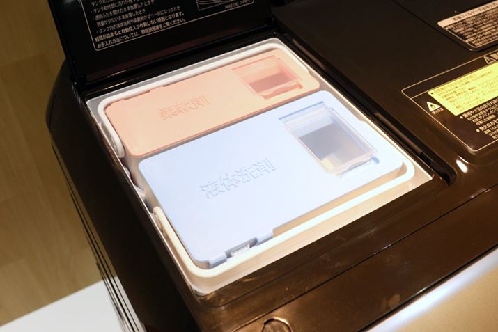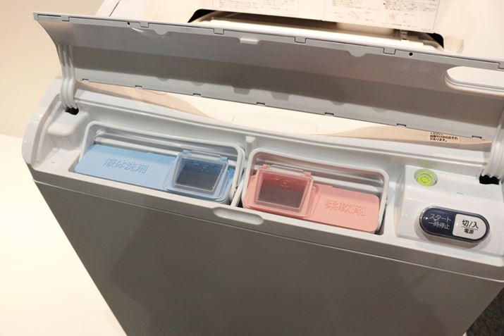 まずは、3機種すべてに共通する機能のひとつ、「液体洗剤・柔軟剤自動投入」を紹介します。液体洗剤・柔軟剤自動投入機能とは、洗濯物の計量後、注射器のようにピストン運動で液体洗剤や柔軟剤を押し出して適量を投入してくれる便利な機能。あらかじめタンクに液体洗剤と柔軟剤を入れておけば、スタートボタンを押すだけで作業が完了するので、洗濯のたびに洗剤を入れる手間が省けます。また、投入した後は経路が水道水で洗い流されるため、洗剤と柔軟剤が混ざることはありません(下の動画参照。なお、デモ機のため洗剤の投入と経路の水洗いは手動で切り替えていますが、実際は自動で実行されます)。