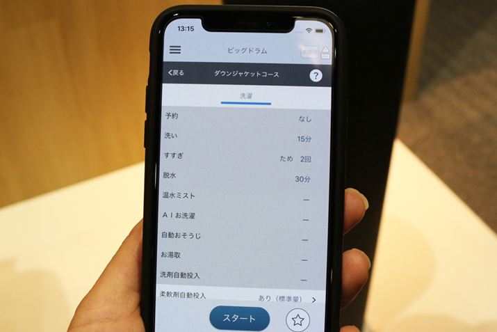 使いたい洗濯コースを見つけたら「スタート」をタップすれば、運転が始まります。工程の詳細も表示されるので、どのような運転が行われるのかも把握可能