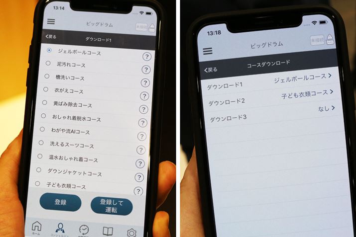 アプリ上にしかない洗濯コースをダウンロードできるのもポイントです。従来も用意されていた機能ですが、9月に2機種(BD-SX110EとBW-DX120E)が発売されたタイミングでアプリがアップデートされ、ダウンロードできる洗濯コースの数が拡充されました。手動で「洗い〇分、すすぎ〇分、すすぎ回数〇回」というように細かく設定すれば同様の洗い方もできますが、そういった手間を省略してくれるのがこの機能の魅力。ダウンロードした洗濯コースは3つまでアプリ上と洗濯機に登録しておけるので、いちいちアプリを起動しなくても洗濯機から洗濯コースを選ぶこともできます。