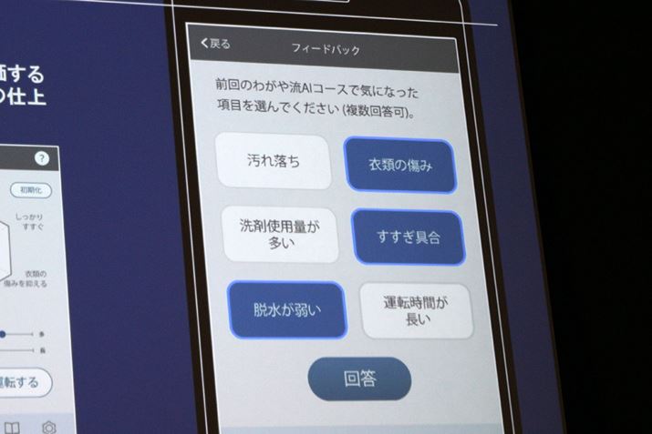 そして、標準コースをユーザーごとにカスタマイズできる「わがや流AIコース」も新たにアプリに追加されました。「わがや流AIコース」で洗濯した後、または次に洗濯する時に、アプリで洗い上がりの評価を実行することで、洗濯プログラムが自分の好みに調節されていきます。