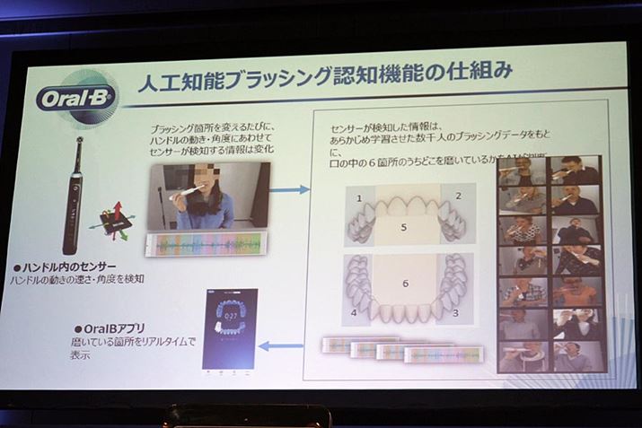 モーションセンサーがブラシの持ち方・動かし方を検知→蓄積されたデータと照合→磨いている個所、磨くべき個所を教えてくれます