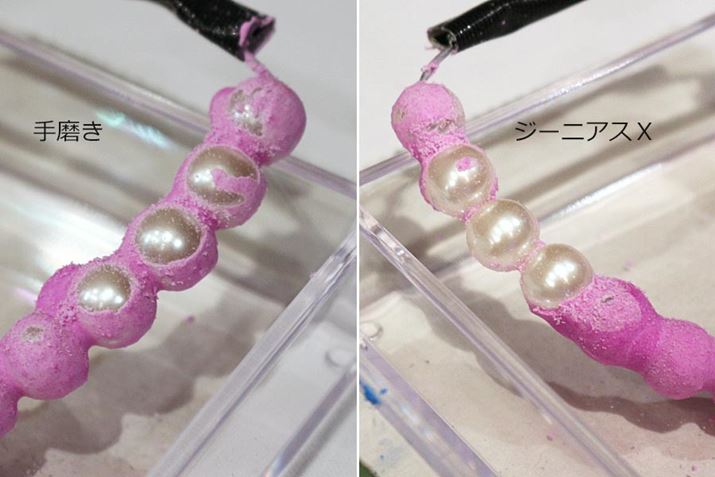 手磨き(左)と「オーラルB ジーニアスX」(右)の歯垢除去力を比較したもの。「オーラルB ジーニアスX」のほうが疑似歯垢が多く取れているだけでなく、歯に見立てた真珠の側面やすき間についた疑似歯垢にまでアプローチできていることがわかります
