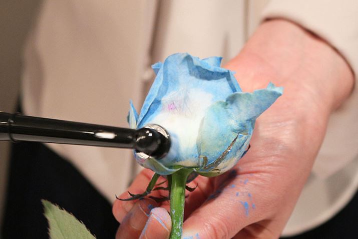 傷が付きやすい生花(白いバラ)の花びらに「オーラルB ジーニアスX」のブラシを当てても、花びらに傷を付けることなく、青の塗料だけを落とします。また、使用中も花びらはほとんど揺れませんでした