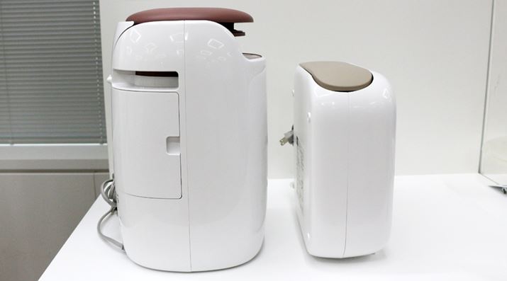 従来モデル「UD-BF1」(左)のサイズが243(幅)×243(奥行)×386(高さ)mm、重量が約4kgなのに対し、新モデル「UD-CF1」(右)はサイズが280(幅)×135(奥行)×297(高さ)mm、重量が約3.1kgになりました。また、「消臭乾燥」運転時の消費電力(60Hz)も従来モデルより40W低い500Wに