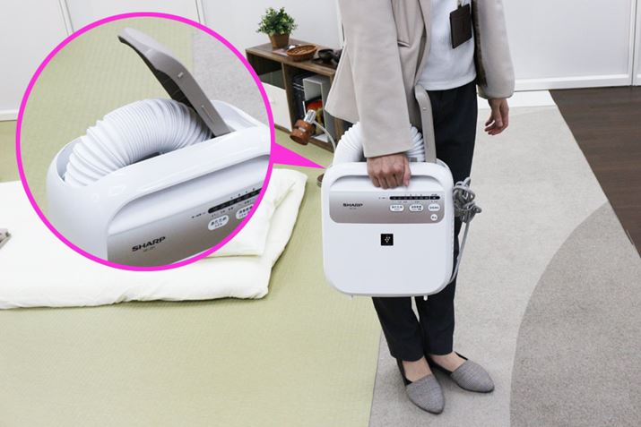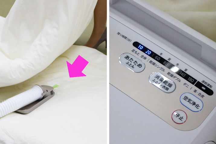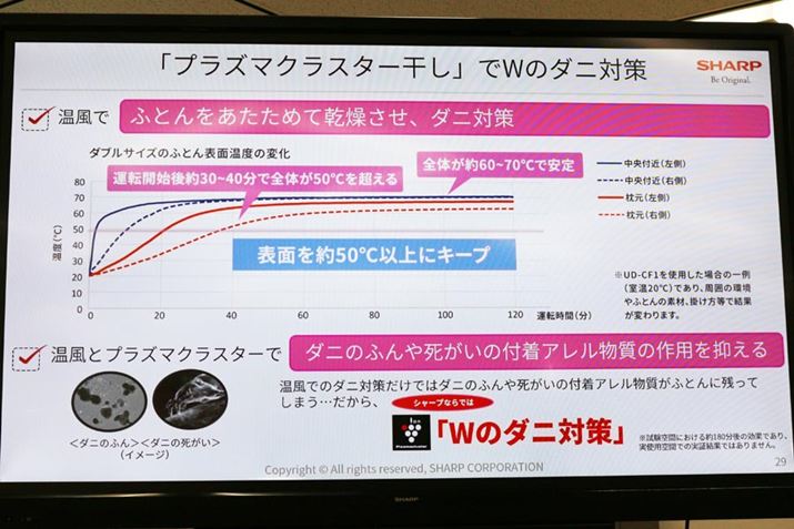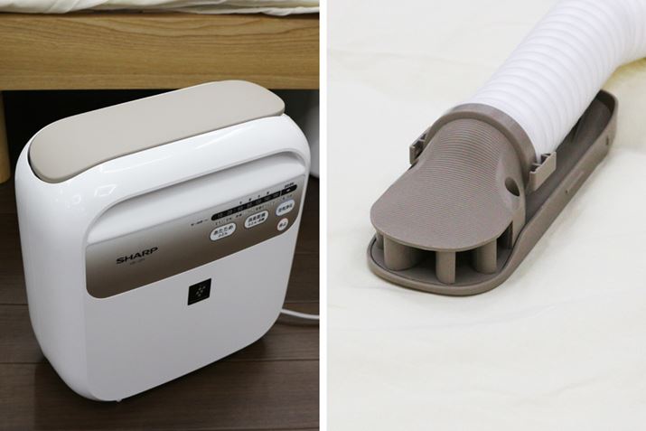 布団乾燥機で乾燥運転すると、布団の表面温度が約50℃以上となるため、ダニ対策にも効果的。また、シャープの布団乾燥機の場合、温風と一緒にプラズマクラスターイオンも放出されるので、ダニのふんや死がいなどの付着アレル物質の作用を抑えてくれるのだそう