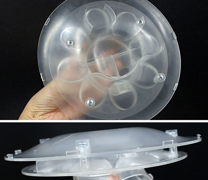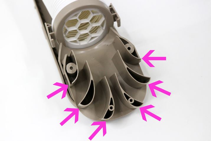 写真は、アタッチメントの内部。複数配置された小さなきのこの傘を沿うように風が流れていくことで効率よく風の向きが変わり、速い風のまま放出されます