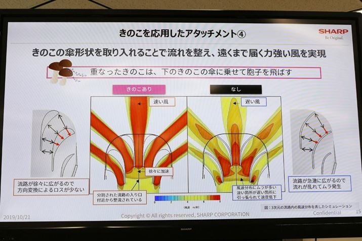 そもそも「きのこアタッチメント」は、自然界の生物の形状や機能を応用する「ネイチャーテクノロジー」から生まれたもので、胞子を風に乗せ、遠くまで飛ばす「きのこの傘」を模しています。湾曲したパーツを配置しても同様のことができそうですが、シャープが行った調査によると、きのこの傘形状でないと風の向きを変える際にロスが生まれてスピードダウンしてしまい、遠くまで到達しないのだそう。