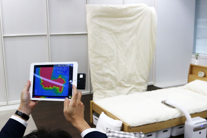 ホースを引き出して、送風口が布団の中央にくるようにセット。サーモグラフィーカメラで映すと、運転前なのでもちろん冷たい状態です