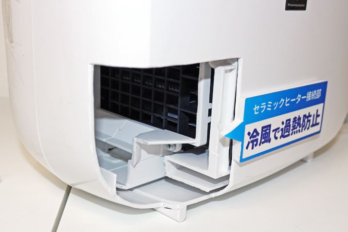 自己温度制御型セラミックヒーターを採用しているので、異常加熱の心配がありません。さらに、ファンで風を送り、ヒーターの接続部を冷却する構造となっています