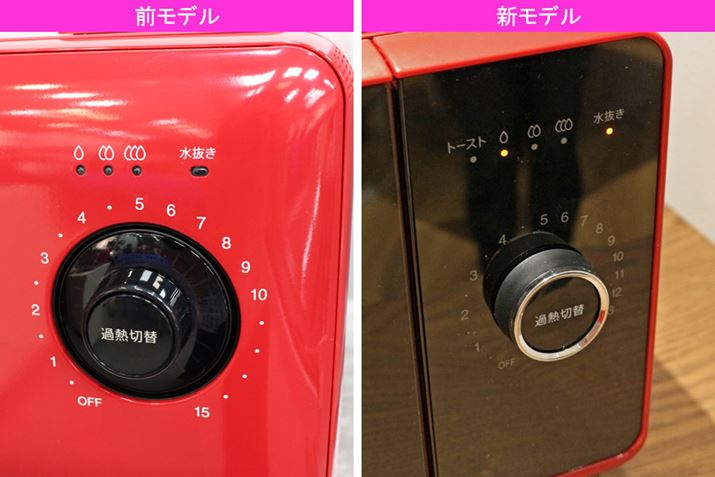 このように操作方法は変わりませんが、前モデルでは「弱」(180℃)、「中」(200℃)、「強」(250℃)の3つだった加熱モードが、新モデルでは「トースト」(250℃)、「弱」(120℃)、「中」(180℃)、「強」(200℃)の4つとなりました。なお、新たに追加された「ふわふわモード」とは「弱モード」のことです。