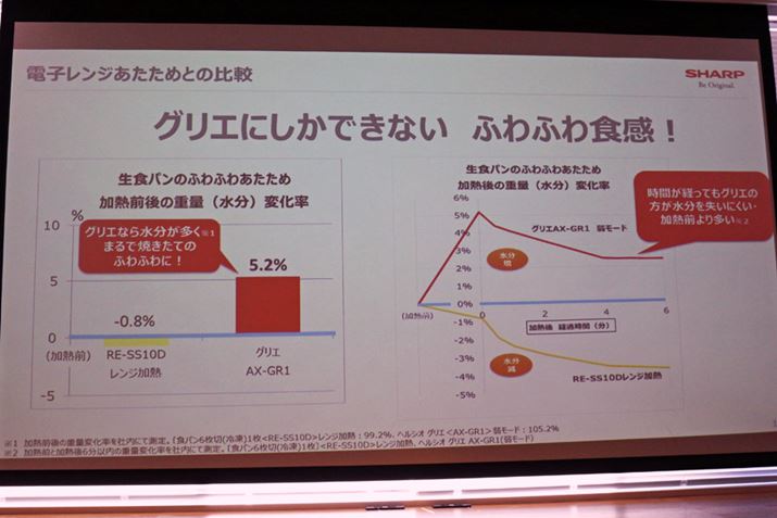レンジ加熱で温めるよりも、ヘルシオ グリエの「ふわふわモード(弱モード)」で加熱したほうが多くの水分が残るだけでなく、加熱前よりも水分量が増えるのだそう