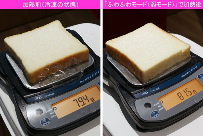 実際に、冷凍した生食パンがどれほど復活するのかデモンストレーションが行われました。「ふわふわモード(弱モード)」は、最大約20mlの水を使い、250℃の高温で焼く通常のトーストを焼く「トーストモード」とは異なり、最大約25mlの水を使い、120℃の低温で加熱するモードとなります。