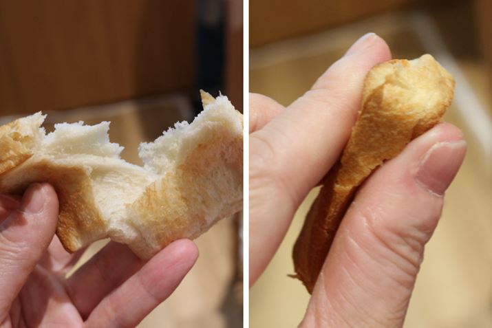割いてみると、クラム(パンの白い部分)が伸びる! これだけ伸びるというのは、水分がたっぷり残っている証拠。また、クラストもサクサクなのに指でつぶしてもパンのカスが散らばらないほどやわらか!