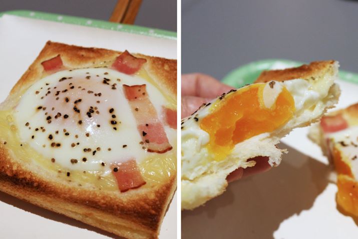 食パンには焼き目が付いていますが、真っ先に焦げそうなベーコンはほどよい加熱具合でやわらかいまま。そして、卵の黄身は半熟状態。いろいろなパンを焼いてみたくなるほど、手軽で見事な仕上がりです