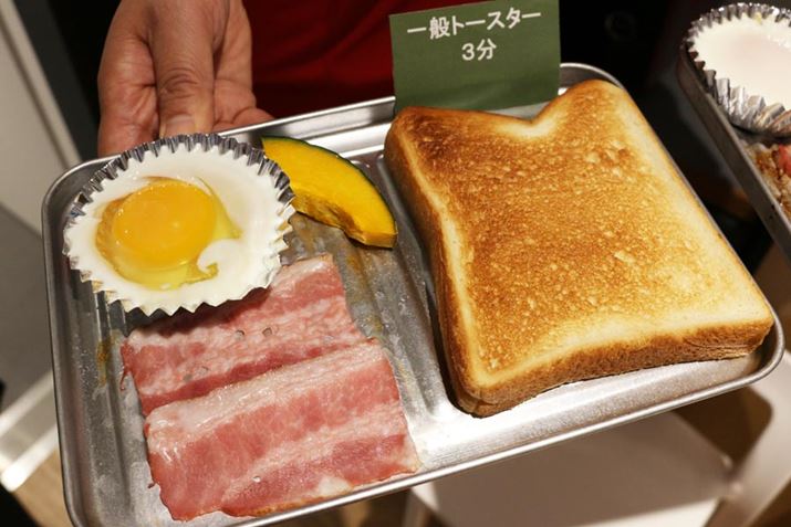 そして、試食はできませんでしたが、一般的なトースターとヘルシオ グリエで異なる食材を1度に加熱した比較が披露されました。同時調理に使われたのは、卵とベーコン、かぼちゃ、食パンと火が通る時間が大きく異なりそうな食材ばかり! その結果が、以下です。