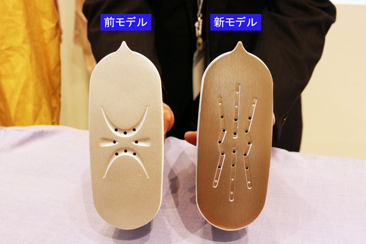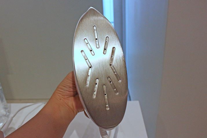 ここまで前モデルから引き続き採用されているコードレス構造について説明してきましたが、ここからは新モデルの進化点を紹介します。新モデル「TAS-X5」で変更されたのは、かけ面。スチーム孔を8個から14個に増やし、スチームがより広範囲に行き渡るようになりました。