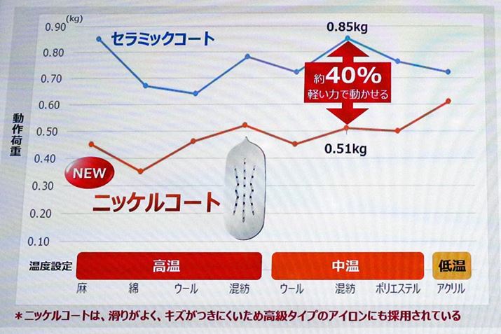 そして、かけ面のコーティングもセラミックコートよりもすべりのよいニッケルコートに変更されました。アイロン台を用意し、普通のアイロンのように使う際、従来よりも約40%軽い力で動かせるようになったそうです。また、ハンガーにかけてある衣類のシワを伸ばす時にも、かけ面のある衣類スチーマーは、スチームを放出するとともにかけ面を当ててシワを伸ばすように使うのがもっとも効率のよい使い方。その際にも、かけ面のすべり性能が向上したことは操作のラクさにつながります。