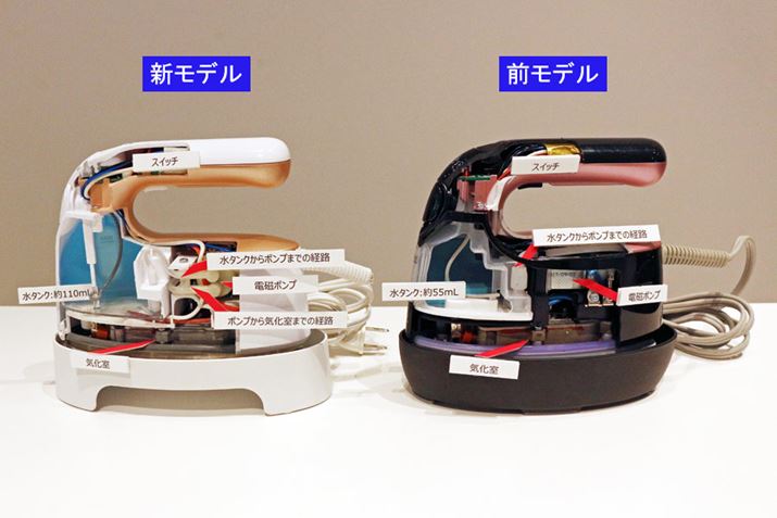 水タンクの一部を本体外郭ケースと一体化することでムダなスペースを削減。本体サイズや重量はそのままに、水タンク容量が55mlから110mlに大きくなりました。途中で給水せずに、ワイシャツなら3枚、ジャケットなら2着を仕上げることができるそうです