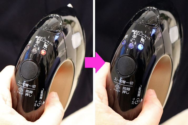 スチームを放出するボタンを押したまま、温度のランプ下にあるボタンを押すと、通常の3倍の量となるパワフルなスチームが噴射されます(下の動画参照)