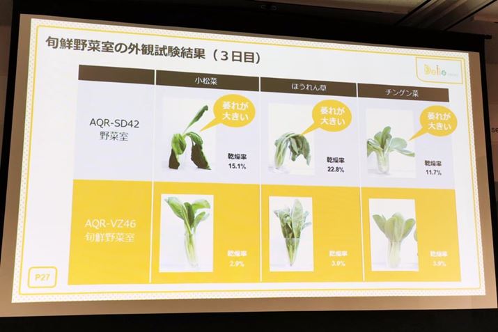 「旬鮮野菜室」とアクア従来機の野菜室で保存した葉物野菜の比較。「旬鮮野菜室」で保存したもののほうが乾燥率が低く、新鮮さがキープされています