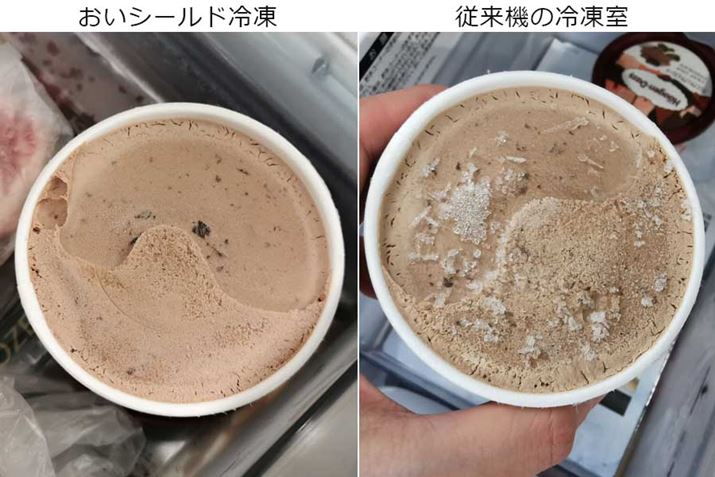 「おいシールド冷凍」で保存したアイスクリーム(左)と、アクア従来機の冷凍室で保存したアイスクリーム(右)を比較。「おいシールド冷凍」で保存したものには霜がまったくついておらず、なめらかな舌触りをキープできそう