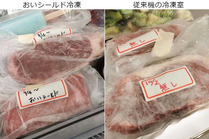 「おいシールド冷凍」で保存した牛肉(左)と、アクア従来機の冷凍庫で保存した牛肉(右)を比較。こちらも「おいシールド冷凍」で保存したものには霜がほとんどついておらず、肉の色も鮮やか