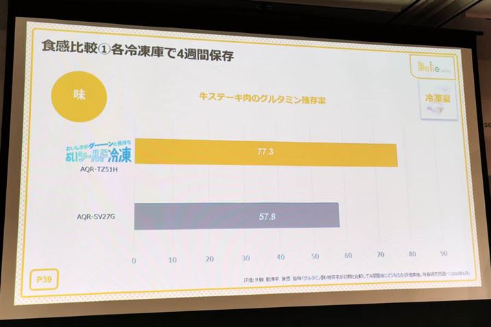 「おいシールド冷凍」で保存した牛肉と、アクア従来機の冷凍庫で保存した牛肉のグルタミン酸(うまみ)残存率を比較したグラフ。「おいシールド冷凍」で保存した牛肉のほうがうまみをキープできていることが、科学的にも証明されています
