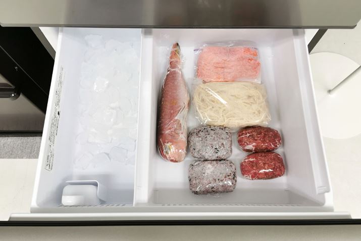 「デリエ」シリーズの下2段は冷凍室。2段合わせて定格内容積はクラス最大級の152Lで、冷凍食品のまとめ買いや下ごしらえの冷凍保存にもしっかり対応できそうです。