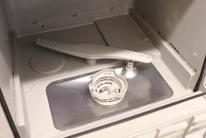 かごの下に配置されている回転ノズルから360°に水を噴射し、汚れを落とします。回転ノズルの手前には、残さいフィルターとメッシュトレイが設置されています