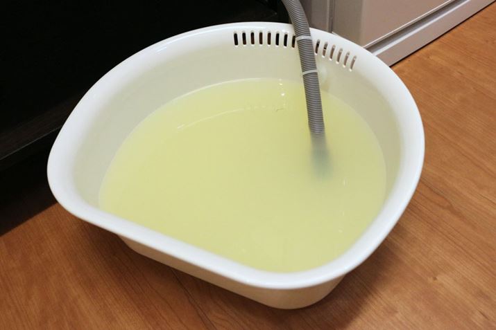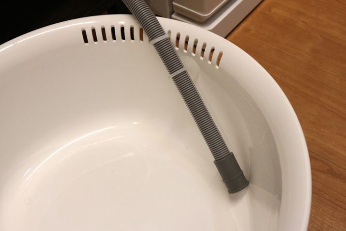 運転終了までの間、数回に分けて水が排出されます。洗い桶で全然イケる! ただ、この排水を捨てないまま連続して使用すると大変なことになるので、排水の処理だけは忘れないように注意です