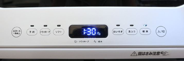 さっそく、朝食で使用した食器を洗ってみます。「SS-M151」に搭載されているコースは、「標準」「念入り」「おいそぎ」「ソフト」の4種類で、各コースと組み合わせできる「ドライキープ」モード(送風と停止を繰り返して、再結露やにおいのこもりを防止する)と、1〜6時間後の運転開始を予約できる予約機能も備えています。