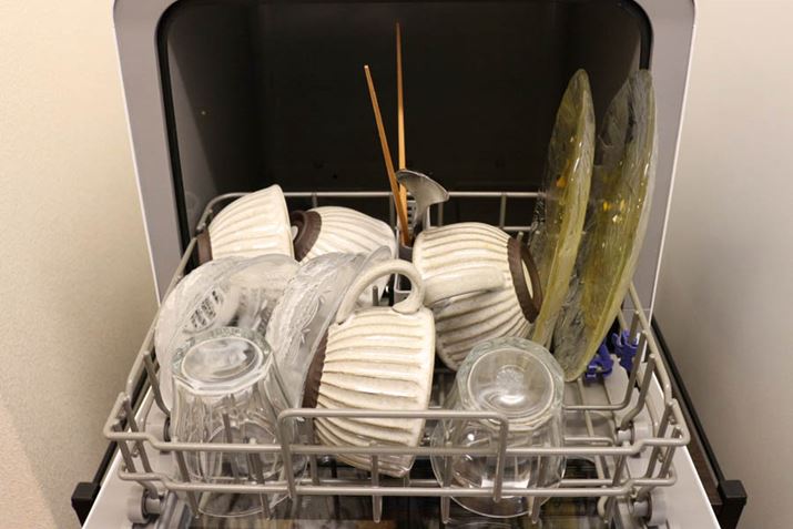 標準収納容量は16点(大皿2点、中皿2点、小皿2点、中鉢2点、小鉢2点、茶わん2点、汁わん2点、コップ2点、小物類)で、家族3人分の食器を1度に洗うことができます。今回は、中皿、茶わん、デザート皿、カップ、グラスを各2点ずつ洗ってみました。